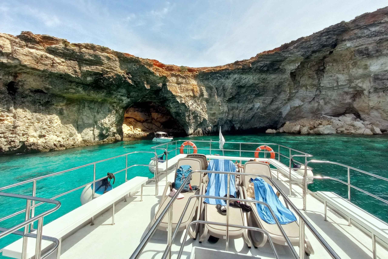 انطلق في رحلة بحرية في ثلاثة خلجان لاستكشاف بحيرة الكريستال والبحيرة الزرقاء وجبلة تل حلفا. استمتع بمغامرات السباحة والغطس في المياه الخلابة لجزر مالطا.
