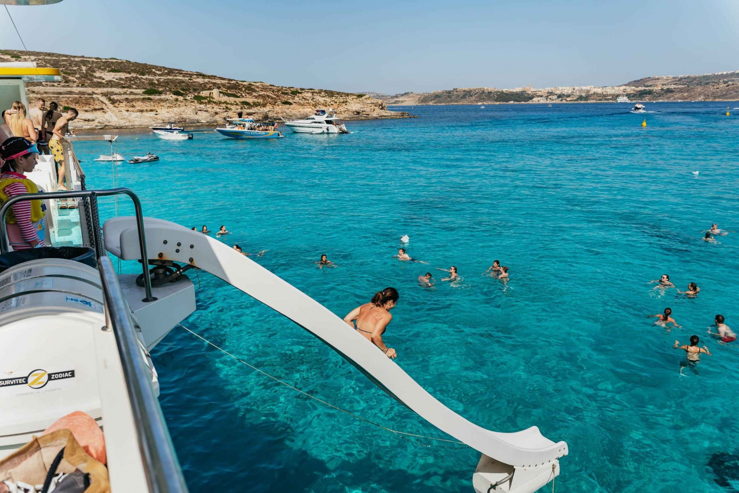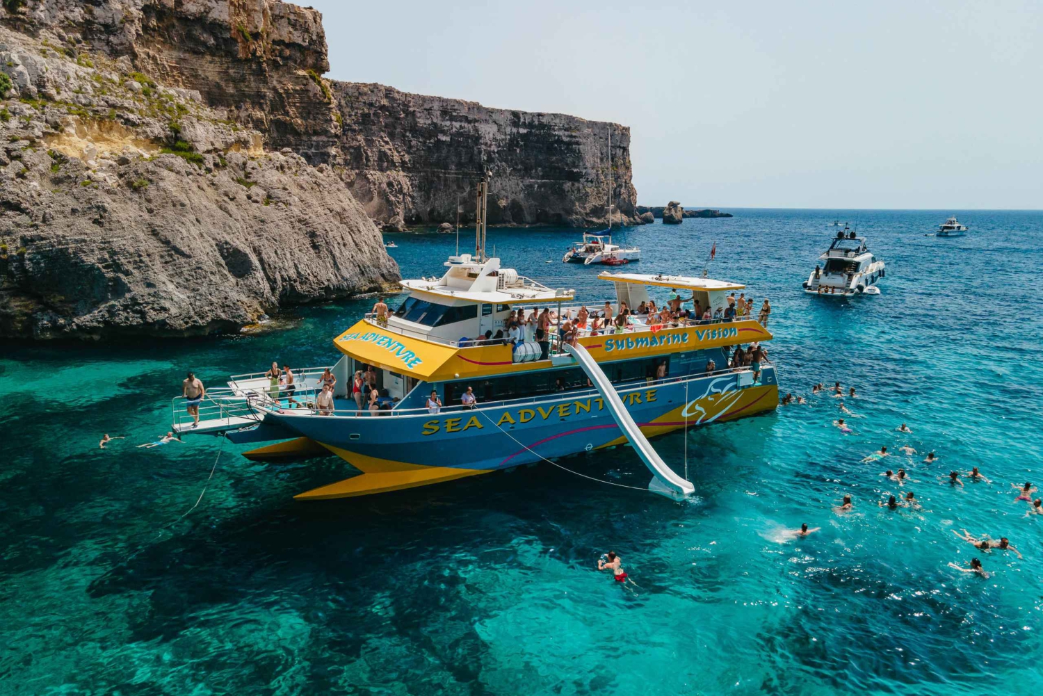 Your journey begins at the Bugibba Jetty, where our modern catamaran's sets off along Malta’s spectacular northern coast. Along the way, you’ll pass dramatic cliffs, hidden coves, and naturally formed sea caves that are only accessible by boat. We also cruise past St. Paul’s Island, home to a prominent statue of the Apostle Paul.
