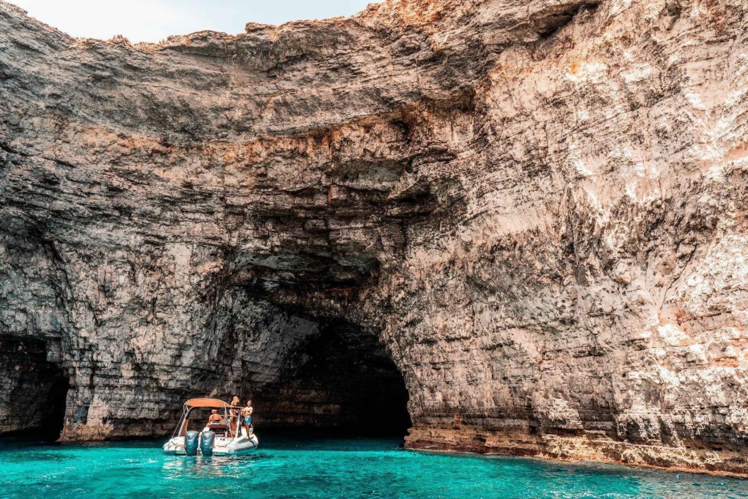 Исследуйте Комино на частном катере — вас ждут кристально чистая вода, скрытые пещеры и умиротворенные уголки.