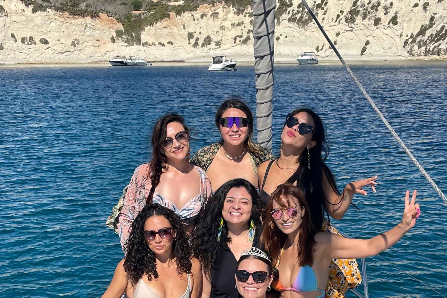 Under hela dagen kan du njuta av gourmetsnacks, en nylagad medelhavslunch, extra på begäran och kylda drycker - allt serverat ombord medan du njuter av panoramautsikten över kusten. Snorklingsutrustning, paddelbrädor och flytringar finns tillgängliga för dem som vill dyka i, eller så kan du varva ner till vågornas mjuka rytm med ett glas vin i handen.